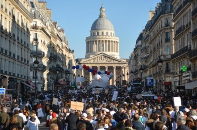 Duke u mbledhur në sheshin Denfert-Rochereau, qytetarët marshuan drejt sheshit Bastille, duke shprehur mosmiratimin e tyre për politikat e reja të qeverisë që anojnë nga e djathta ekstreme.