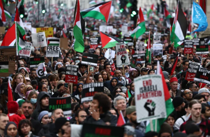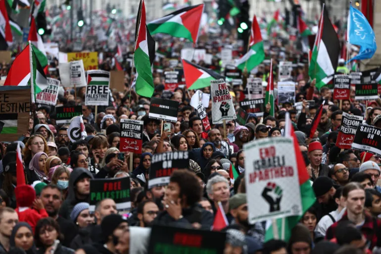 Në Londër, policia vlerësoi se “deri në 100,000” protestues marshuan nëpër rrugët e qytetit të lagura nga shiu, duke valëvitur flamujt palestinezë dhe duke brohoritur “ndalo bombardimin e Gazës”, shkruan Aljazeera transmeton Arbresh.info