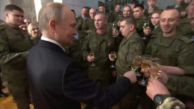 Televizioni shtetëror shfaqi Putinin duke ngritur një gotë shampanjë të rrethuar nga ushtarë dhe duke u thënë rusëve se “drejtësia morale, historike” ishte në anën e tyre.