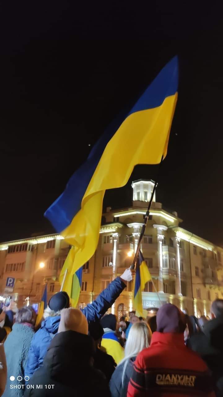 Pro-Ukraine rally in Mariupol last night. This strategic port city on the Azov sea, in Donetsk region, could be one of the first targets in a case of further Russian invasion of Ukraine. People here won't be welcoming Russian soldiers.