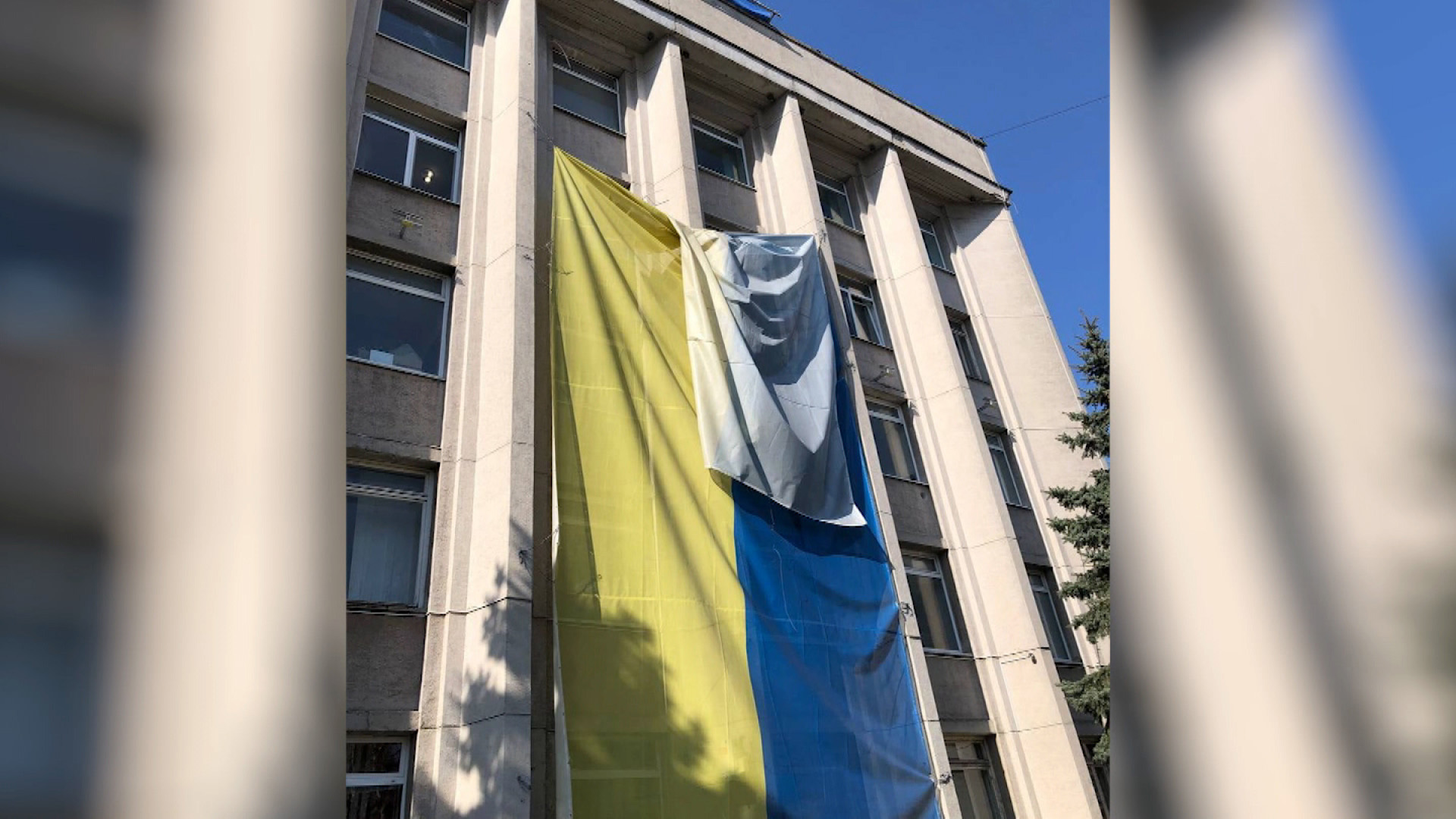 A image of the Ukrainian flag hanging from the Kherson City Hall is seen on March 24. (From Ihor Kolykhaev)