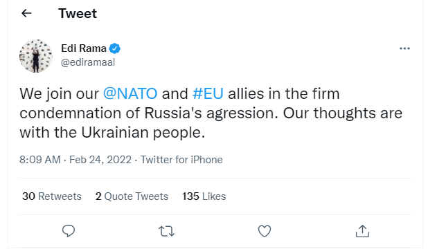 “Ne bashkohemi me aleatët tanë të NATO-s dhe BE-së në dënimin e ashpër të agresionit të Rusisë. Mendimet tona janë me popullin ukrainas”, shkruan Rama./arbresh.info/
