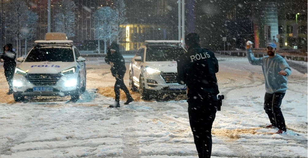 Policët me detyrë në rajonin Taksim të Stambollit luajtën me topa bore me qytetarët, raportojnë mediat turke.