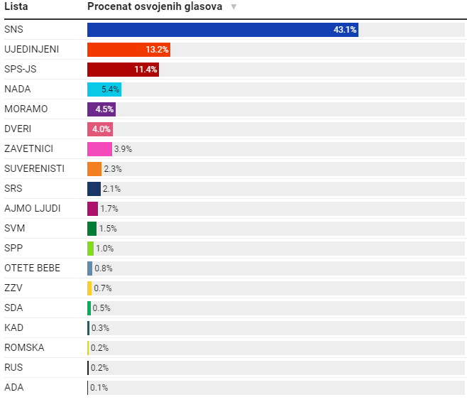 Sipas rezultateve të para preliminare të publikuara për zgjedhjet parlamentare nga IPSOS / CeSid në bazë të 68.4 për qind të mostrës së përpunuar në zgjedhjet parlamentare në Serbi, lista “Aleksandar Vuçiq – Së bashku mund të bëjmë gjithçka” ka fituar më shumë vota, me 43.1 për qind të votuesve. .