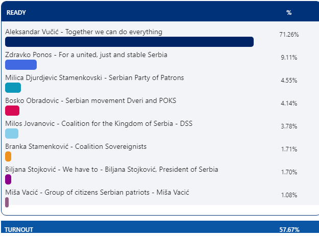 Deri më tani raportohet se Aleksandër Vuçiq është duke udhëhequr me 70% të votave.