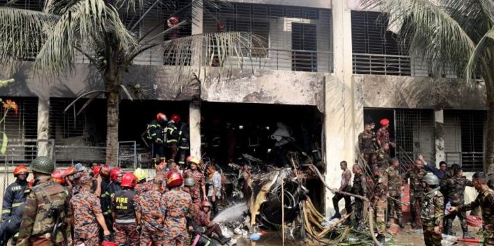 Pamjet nga vendi i ngjarjes në shkollën dhe kolegjin Milestone në periferinë veriore të Uttara tregojnë një zjarr të madh, pas përplasjes së avionit në ndërtesën e shkollës dykatëshe.