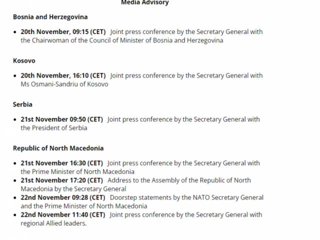 Në njoftimin për media bëhet e ditur se të dielën, më 19 nëntor, Sekretari i Përgjithshëm i NATO-s do të udhëtojë në Bosnje dhe Hercegovinë, ku do t’i takojë anëtarët e Presidencës.