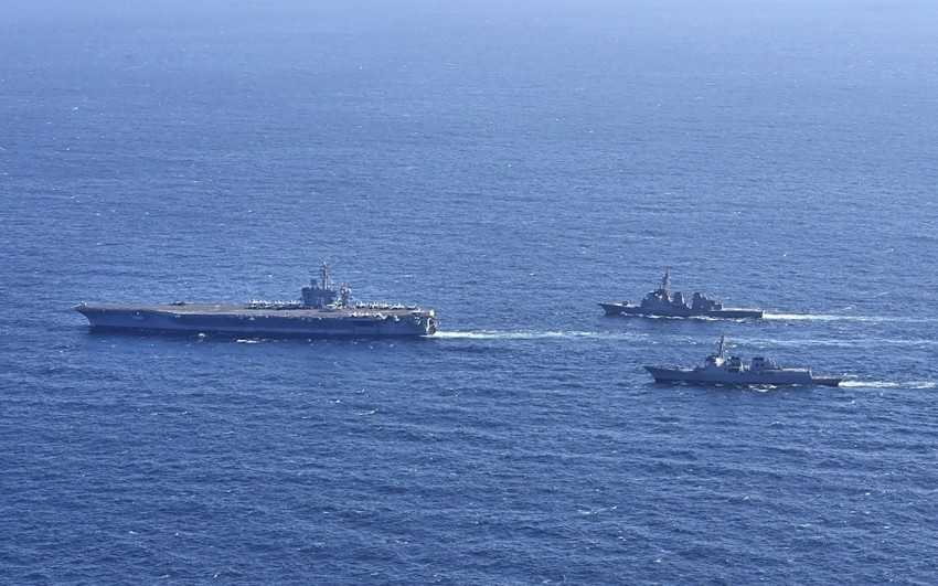 In this photo provided by South Korea's Joint Chiefs of Staff, the aircraft carrier USS Carl Vinson, left, sails with South Korean Navy's Aegis destroyer King Sejong the Great and Japan's Maritime Self-Defense Force Aegis destroyer Kongou in the international waters of the southern coast of Korean peninsular during a recent joint drill in 2024. The three countries conducted combined naval exercises involving the American aircraft carrier in their latest show of strength against nuclear-armed North Korea, South Korea’s military said Wednesday, Jan. 17, as the three countries' senior diplomats were to meet in Seoul to discuss the deepening standoff with Pyongyang. (South Korea's Joint Chiefs of Staff via AP)
