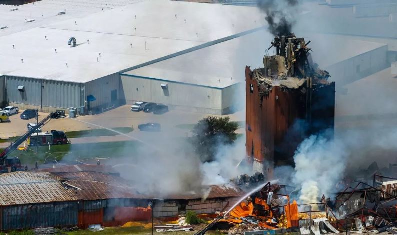 Shpërthimi rreth mesditës së të martës copëtoi majën e kullës së uzinës, duke ekspozuar betonin dhe armaturën e dëmtuar, ndërsa muret metalike dhe çatia e ndërtesës poshtë ishin të shembur dhe të djegur.