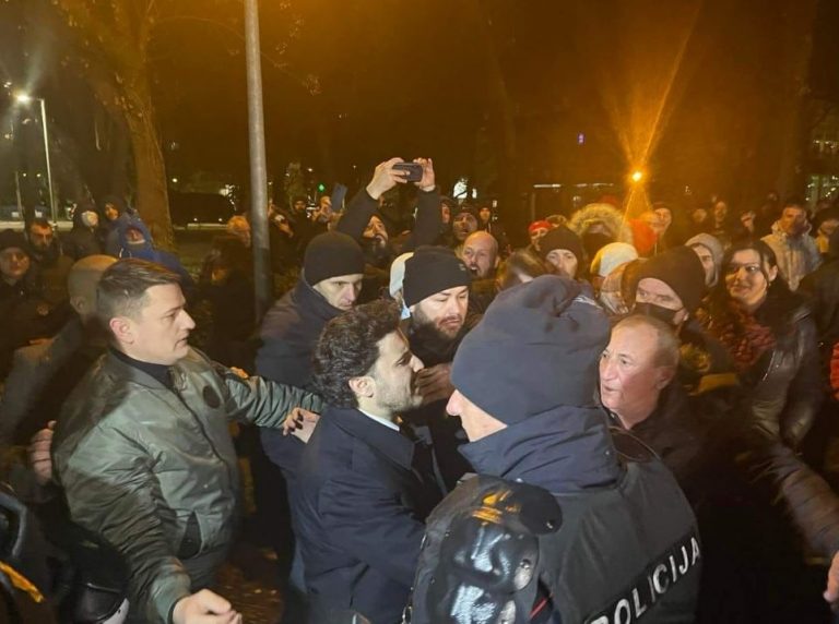 Zëvendëskryeministri Dritan Abazoviq, i cili sonte ishte edhe mysafir në televizionin publik, doli para të mbledhurve, ndërsa policia ka parandaluar incidentin.