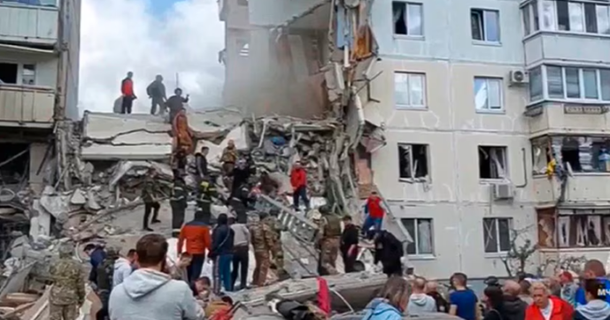 Pamje nga vendi i ngjarjes – të postuara nga guvernatori i këtij rajoni në kufi me Ukrainën, Vyacheslav Gladkov – shfaqën shembjen e së paku 10 kateve të ndërtesës.