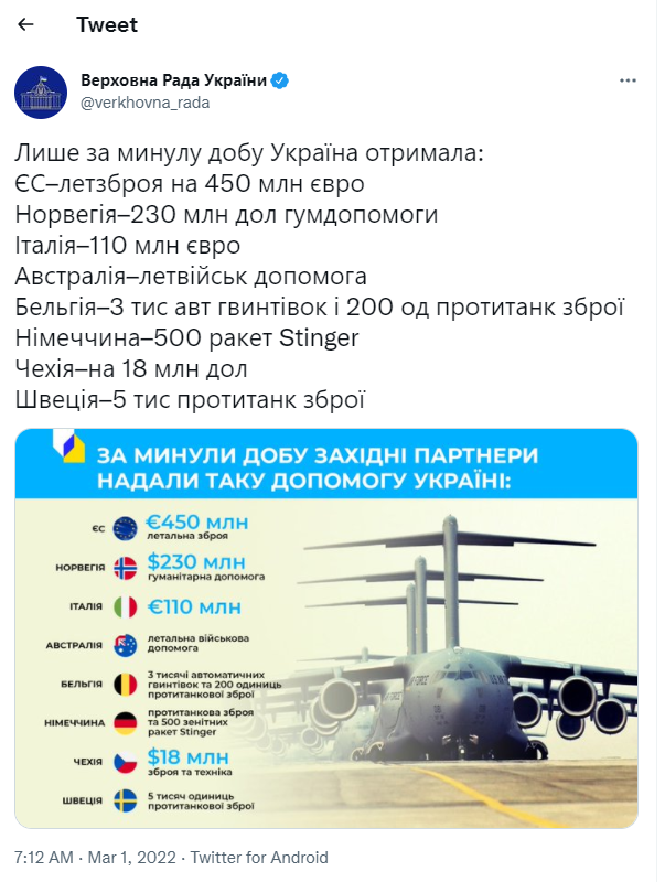 Sipas të dhënave nga Parlamenti i Ukrainës, gjatë ditëve të fundit, Ukraina ka pranuar armë nga BE-ja në vlerë 450 milionë euro, 230 milionë dollarë nga Norvegjia ndihmë humanitare, 110 milionë euro nga Italia.