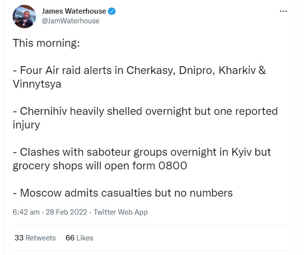 “Katër alarme për sulm ajror në Cherkasy, Dnipro, Kharkiv dhe Vinnytsya. Chernihiv bombardohet rëndë gjatë natës, u raportua për një plagosje. Përleshje me grupet diversante gjatë natës në Kiev, por dyqanet ushqimore do të hapen nga 0800. Moska pranon viktima por jo shifra”, ka shkruar James./arbresh.info/