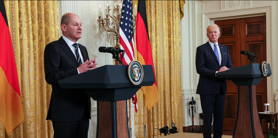 Kancelari gjerman Olaf Scholz ra dakord, por nuk kërcënoi se do të ndalonte gazsjellësin Nord Stream 2. Gazsjellësi ende i painauguruar ka kapacitetin të dërgojë 55 miliardë metra kub gaz natyror nga Rusia në Evropë çdo vit.