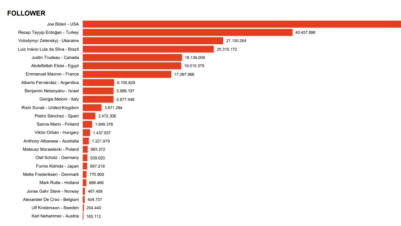 Presidenti amerikan Joe Biden, ai turk Rexhep Tajip Erdogan dhe ukrainasi Volodymyr Zelensky janë liderët botërorë më të ndjekur në rrjetet sociale, ndërsa braziliani Inacio Lula da Silva është më aktivi. Në anketim mungon presidenti rus Vladimir Putin, i cili nuk ka llogari personale në asnjë nga tre platformat kryesore të marra në konsideratë; Facebook, Instagram dhe Twitter.
