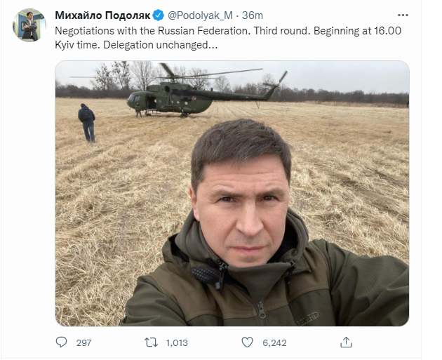“Negociatat me Federatën Ruse. Raundi i tretë. Fillimi në orën 16:00 me orën e Kievit. Delegacioni i pandryshuar…” ka shkruar ai. /arbresh.info/