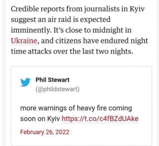 Në këto momente po pritet që të ndodh një sulm i rëndë ajror në Kiev, raporton The Guardian duke cituar raportimet e gazetarëve ukrainas në Kiev.