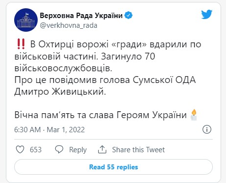 Më shumë se 70 ushtarë ukrainas janë vrarë pasi artileria ruse goditi një bazë ushtarake në Okhtyrka, një qytet midis Kharkiv dhe Kievit, shkroi kreu i rajonit në Telegram.