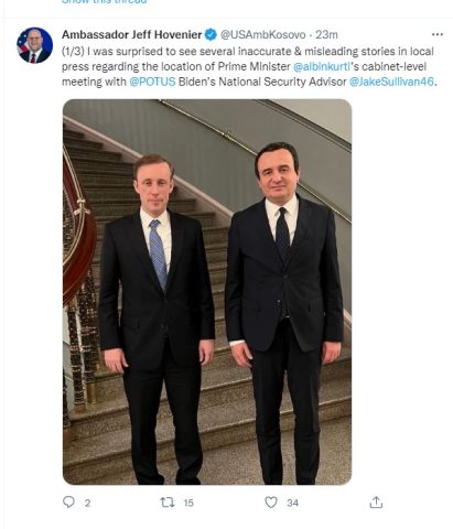 “U befasova kur pashë disa shkrime të pasakta dhe mashtruese në shtypin lokal në lidhje me vendndodhjen e Kryeministrit Albin Kurti gjatë takimit me këshilltarin e Sigurisë Kombëtare, Jake Sullivan”, shkruan Hovenier.