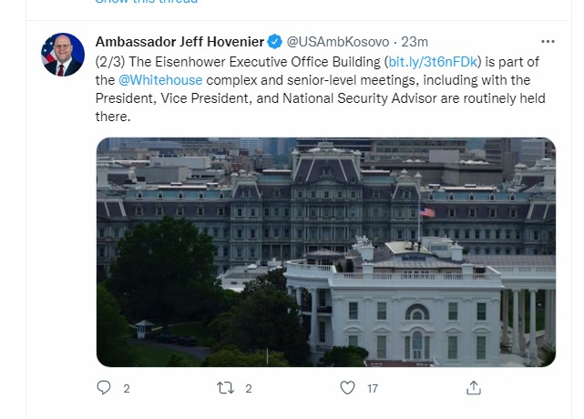 Hovenier ka thënë se është i befasuar me siç ka thënë ai disa raportimet të pasakta dhe çorientuese sa i përket lokacionit të takimit në mes të kryeministrit Albin Kurti dhe këshilltarit të Joe Biden, Jake Sullivan.