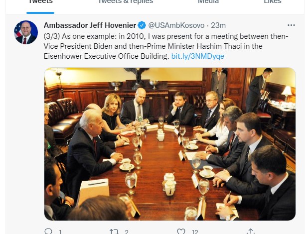 Ambasadori ka publikuar edhe një fotografi të vitit 2010, ku shihet e ka qenë prezent në takimin në mes të Joe Biden sa ka qenë zv.president dhe Hashim Thaçit si kryeministër i Kosovës, e që është mbajtur pikërisht në ndërtesën ku edhe Kurti dhe Sullivan janë takuar.