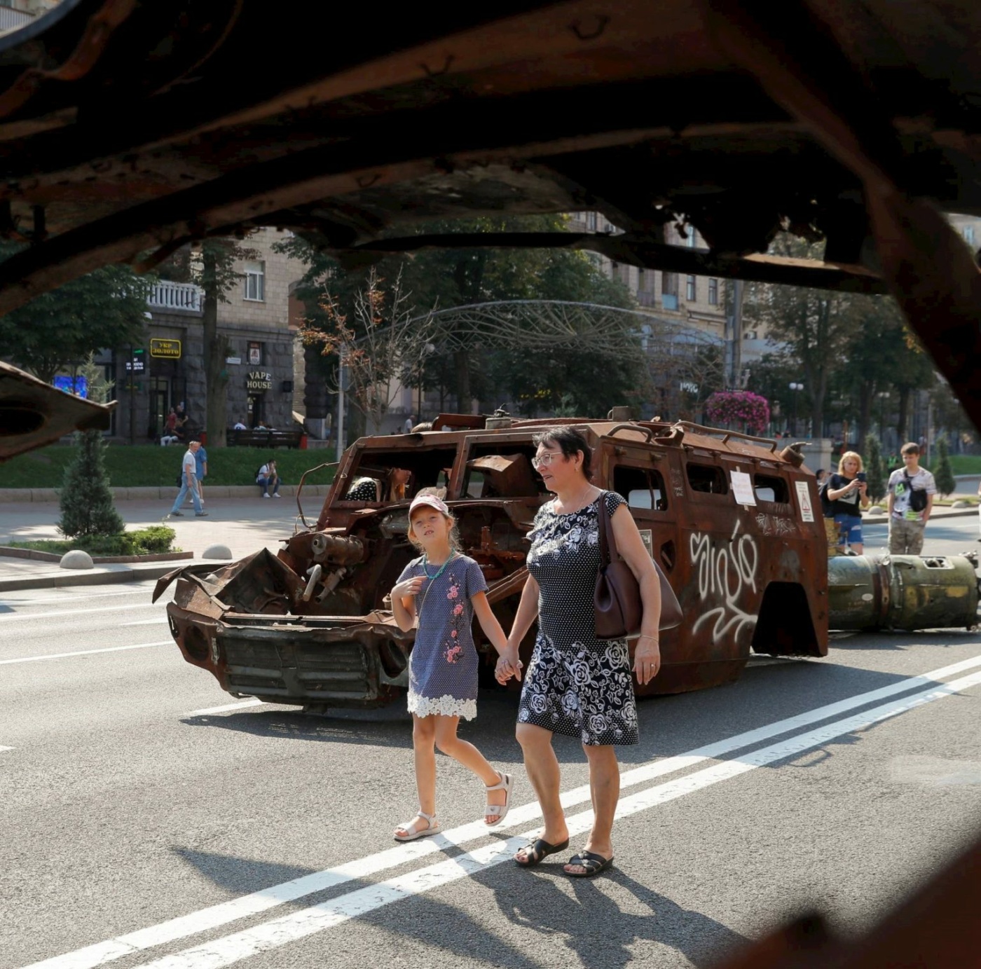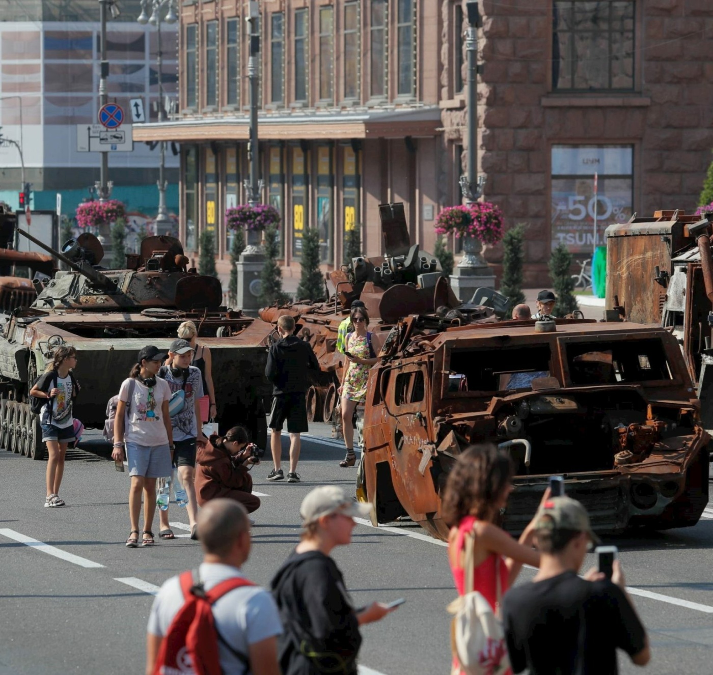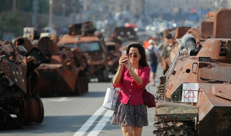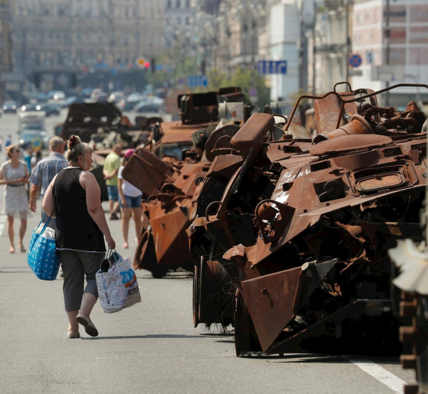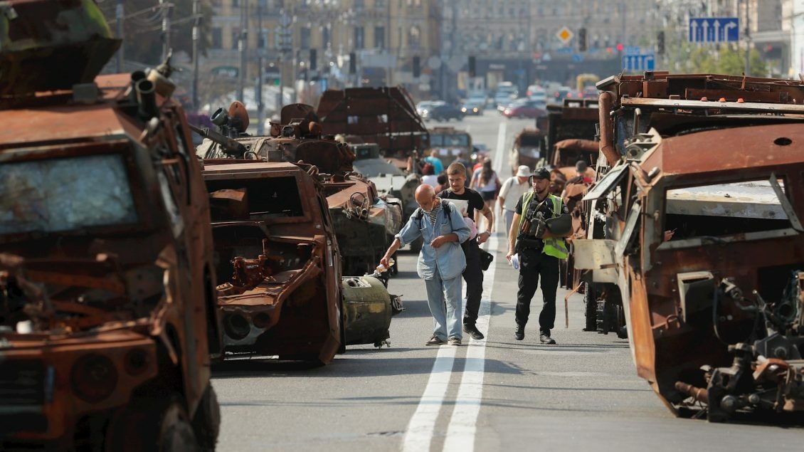 Festa kombëtare, e cila shënon 32 vjetorin e pavarësisë nga Moska, bie saktësisht 18 muaj pasi Rusia nisi një pushtim ndaj fqinjit të saj jugor. Njerëzit ecnin përgjatë rrugës Hresçatik në zemër të kryeqytetit, duke parë armaturën e djegur të mjeteve të blinduara luftarake dhe pjesëve të tjera të pajisjeve, të rreshtuara në një rresht të gjatë si një paradë ushtarake e të vdekurve.