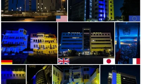 Qeveria e Kosovës dhe objektet e disa ambasadave të huaja në Kosovë mbrëmë u mbuluan me ngjyrat verdh e kaltër për të shënuar Ditën e Pavarësisë së Ukrainës – derisa ky vend po përballet me agresionin e Rusisë.