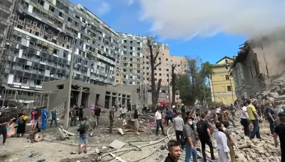Një video e incizuar nga Radio Evropa e Lirë në spitalin e fëmijëve, Ohmadyt, në Kiev, shfaqi radhë të njerëzve që po ndihmonin të pastronin vendin nga rrënojat e ndërtesës.