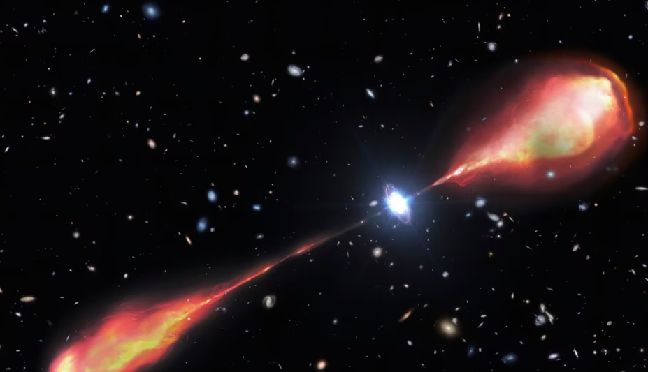 Disa nga objektet më të ndritshme në univers, kuazarët janë bërthama galaktike me gaz dhe pluhur që bien në një vrimë të zezë, duke çliruar një sasi të jashtëzakonshme energjie që i bën ata jashtëzakonisht të ndritshëm. Masa e këtij kuazari është sa 450 milionë herë masa e diellit tonë me një vrimë të zezë që nuk është veçanërisht masive./voa