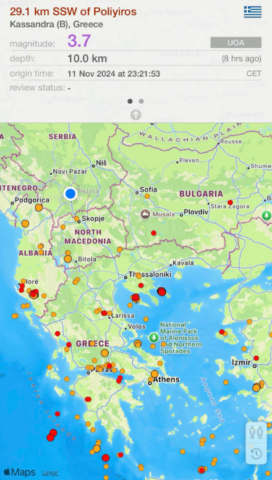 Një tërmet me magnitudë 3.7 ballë të shkallës Rihter ka ndodhur në orën 00:21 pas mesnate në një zonë nënujore të Gjirit Thermaikos, pranë bregut perëndimor të Halkidikit.