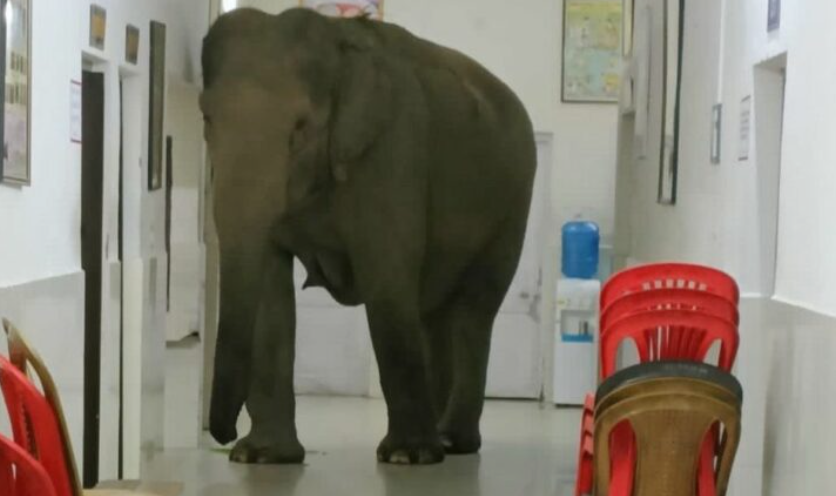 Tre elefantë janë fotografuar në një spital ushtarak në Indi. Ata shihen duke shëtitur nëpër korridoret e spitalit dhe pse me vështirësi nga madhësia e trupit të tyre.
