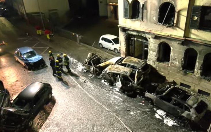Përplasjet kanë bërë që disa makina, fasada e një shtëpie dhe vetë kamioni të përfshihen nga flakët ndërkohë që banorët e shtëpisë janë evakuuar.