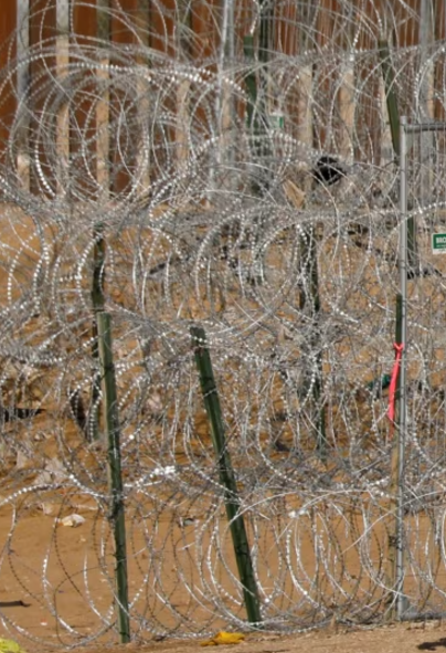 Një migrante në kufirin mes Shteteve të Bashkuara dhe Meksikës, si dhe një pjesëtar i Gardës Kombëtare të Teksasit.