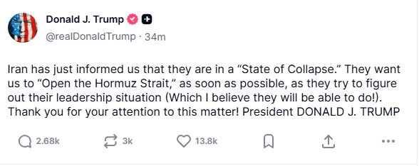 Presidenti i SHBA-së, Donald Trump, ka pretenduar në një postim të ri në Truth Social se Irani “sapo ka informuar” Uashingtonin se ndodhet në një “gjendje kolapsi”.