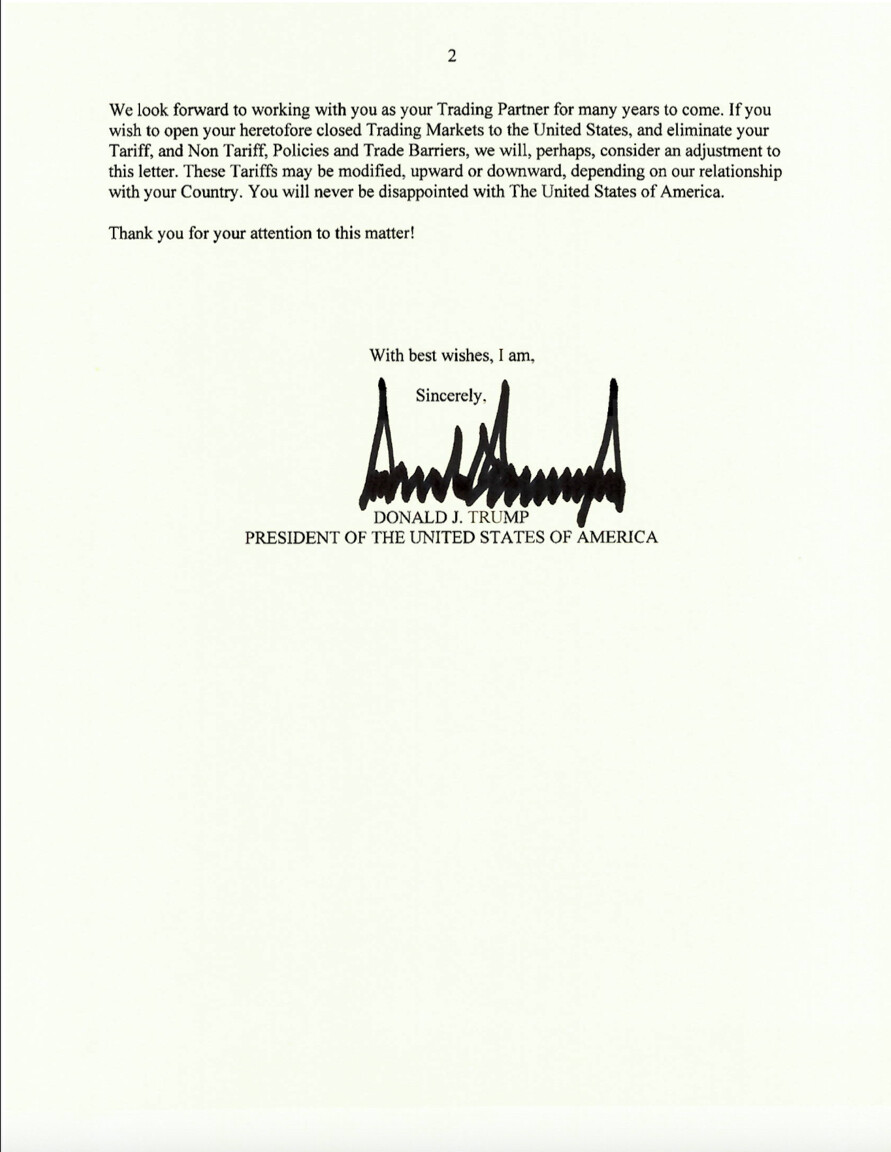 Një letër e ngjashme iu dërgua edhe kryetarit të presidencës së Bosnjë e Hercegovinës, Zhelko Cvijanoviq, për tarifën 30% ndaj importeve nga ky vend.