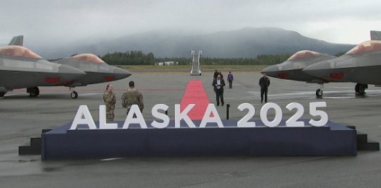 Është shtruar një qilim i kuq, me aeroplanë luftarakë të pozicionuar në të dyja anët e një shenje “Alaska 2025”