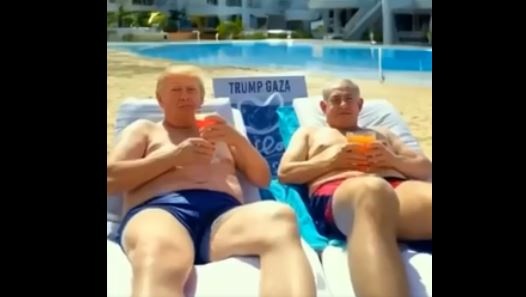 Një kornizë e veçantë tregon një hotel luksoz të quajtur “Trump Gaza”, dhe shihet Trumpi duke u relaksuar me liderin izraelit, Benjamin Netanyahu.