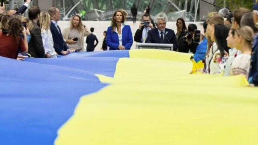 Flamuri ukrainas 30 metra i gjatë është shpalosur para ndërtesës së Komisionit Evropian në Bruksel me rastin e shënimit të Ditës së Flamurit Kombëtar të vendit.