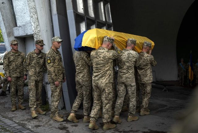 Arkivoli i Simonovas ishte i mbështjellë me flamurin e Ukrainës blu e verdhë, me një luan lodër sipër.