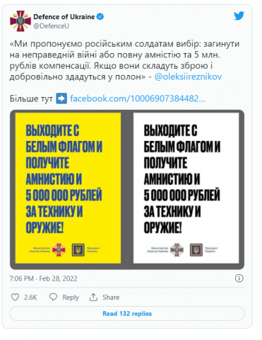 Ministri i Mbrojtjes i Ukrainës, Oleksi Reznikov, e ka publikuar ofertën e shtetit të tij për ushtarët rus që kanë hyrë në këtë territor që nga fillimi i sulmeve në orët e para të së enjtes.