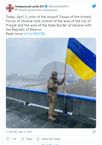 Shtabi i Përgjithshëm i Forcave të Armatosura të Ukrainës ndau një imazh të një ushtari duke ngritur një flamur ukrainas përpara centralit bërthamor të Çernobilit.