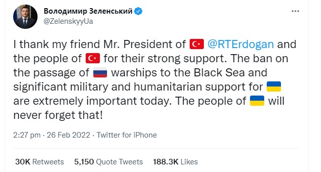 “Falenderoj mikun tim zotin President të ?? @RTERdogan dhe popullin e ?? për mbështetjen e fortë. Ndalimi i kalimit të ?? luftanijeve në Detin e Zi dhe mbështetja e konsiderueshme ushtarake dhe humanitare për ?? janë jashtëzakonisht të rëndësishme sot. Njerëzit e ?? nuk do ta harrojnë kurrë këtë!”, kishte shkruar Zelensky.