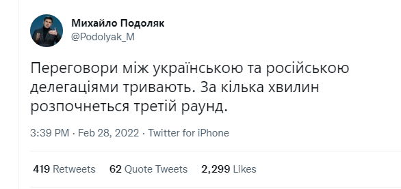 Kështu ka njoftuar Mykhailo Podoliak, këshilltar i kreut të Zyrës së Presidentit.