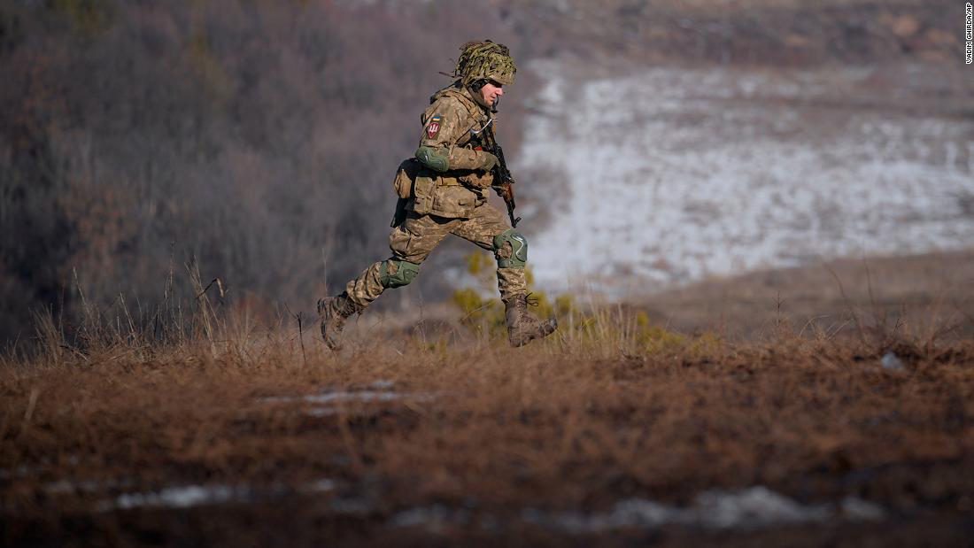 A Ukrainian serviceman runs during an exercise in the Joint Forces Operation, in the Donetsk region, eastern Ukraine, Tuesday, Feb. 15, 2022. Russia said Tuesday that some units participating in military exercises would begin returning to their bases, adding to glimmers of hope that the Kremlin may not be planning to invade Ukraine imminently. (AP Photo/Vadim Ghirda)