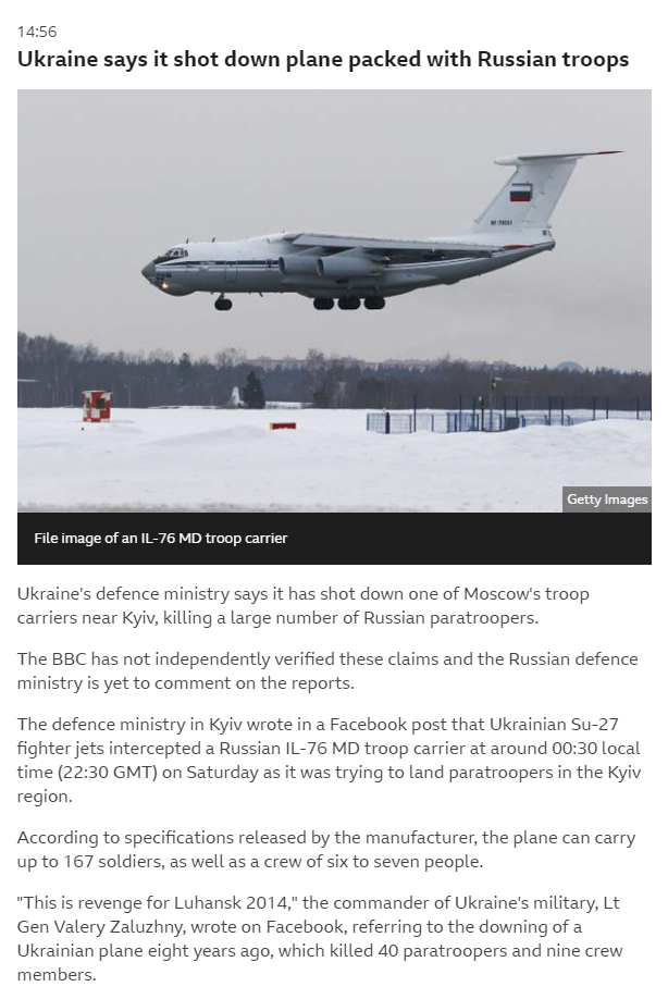 Ministria e Mbrojtjes në Kiev shkroi në një postim në Facebook se avionët luftarakë ukrainas Su-27 kapën një transportues trupash ruse “IL-76 MD”, teksa po përpiqej të zbarkonte parashutistët në rajoni i Kievit, shkruan BBC.
