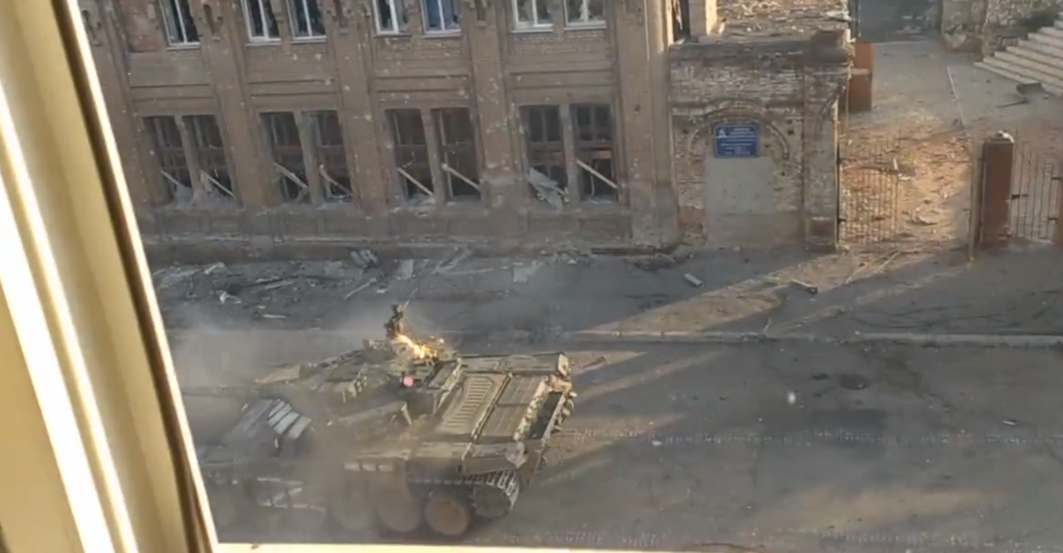 Nga pamjet shihet se si një ukrainas shkrep raketën nga ballkoni i ndërtesës dhe godet tankun rus që ishte në lëvizje