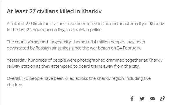 Gjithsej 27 civilë ukrainas janë vrarë në qytetin verilindor të Kharkiv në 24 orët e fundit, sipas policisë ukrainase.