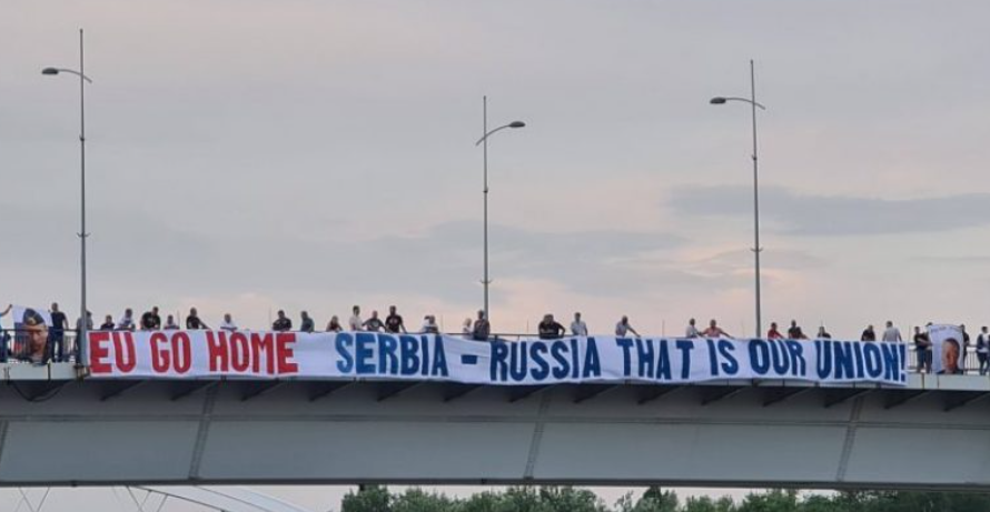 Rreth 30 persona mbanin pankartën, në një leckë të bardhë, me germa të kuqe dhe kaltër, në anglisht shkruhej fjalët “BE, shko në shtëpi. Serbi-Rusi, ky është bashkimi ynë”