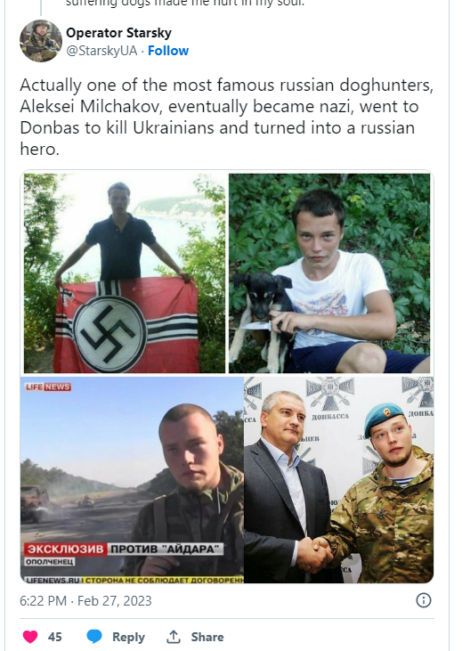 Milchakov u mburr hapur për fotografimin e trupave të gjymtuar dhe të djegur të ukrainasve, dhe njihet gjithashtu për prerjen e veshëve të ushtarëve të vdekur ukrainas dhe gdhendjen e svastikave në fytyrat e tyre.