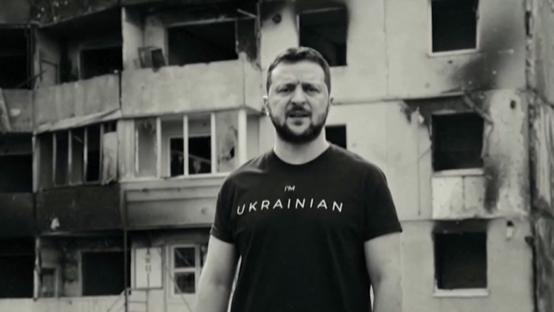 Pamjet në video treguan liderin ukrainas në sfondin e ndërtesave të shkatërruara të banimit.